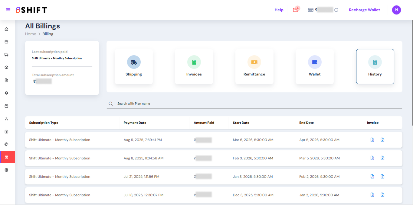 The Billing Module in Shift gives you a clear and organized view of all billing-related details for your shipments. It is divided into five tabs, with each tab focusing on a specific part of the billing process: Shipping, Invoices, Remittance, Wallet, and History.