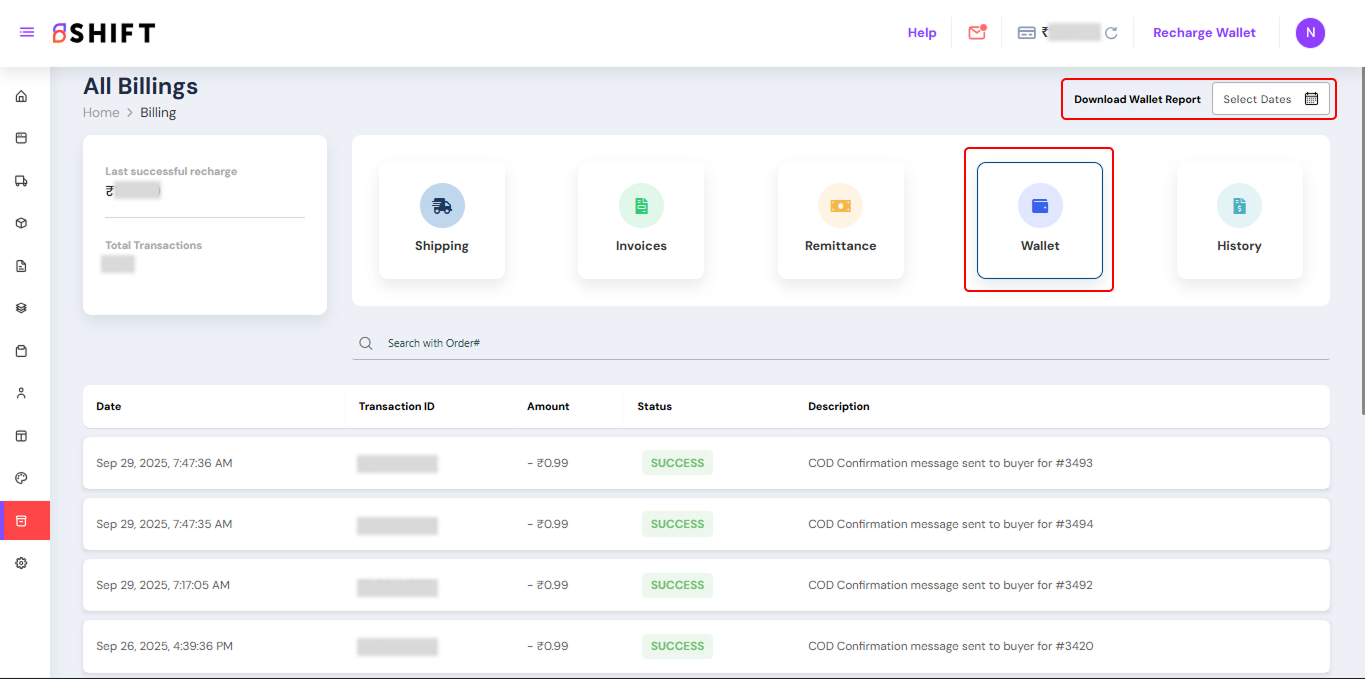 - Wallet – The Wallet tab provides a complete overview of your billing transactions, including wallet recharges, weight discrepancy (WD) charges, shipping charges, and WhatsApp communication charges, and any account-level deductions or adjustments.