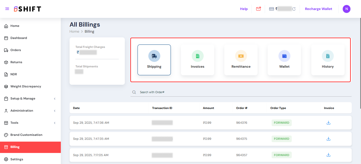 The Billing section on Shift gives you complete visibility into your logistics expenses, payments, and remittance history, all in one place. Whether you’re tracking shipping charges, downloading GST invoices, monitoring COD remittances, or reviewing your wallet transactions, this section ensures transparency and simplifies financial management for your business.