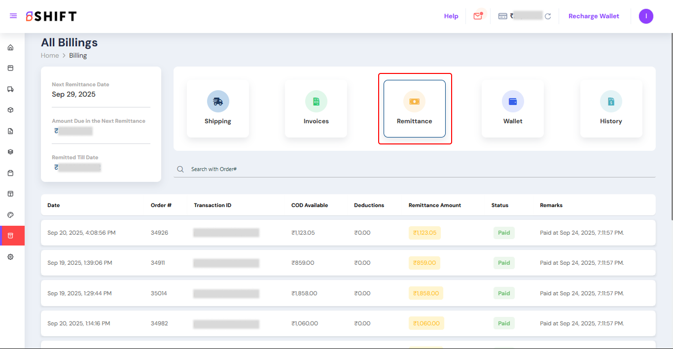 - Remittance – The Remittance tab shows all information related to COD settlements, including the amount remitted and the remittance date, and the transaction ID for each order. It allows you to track both completed and pending remittances, giving you clear visibility into settlement amounts and overall cash flow.