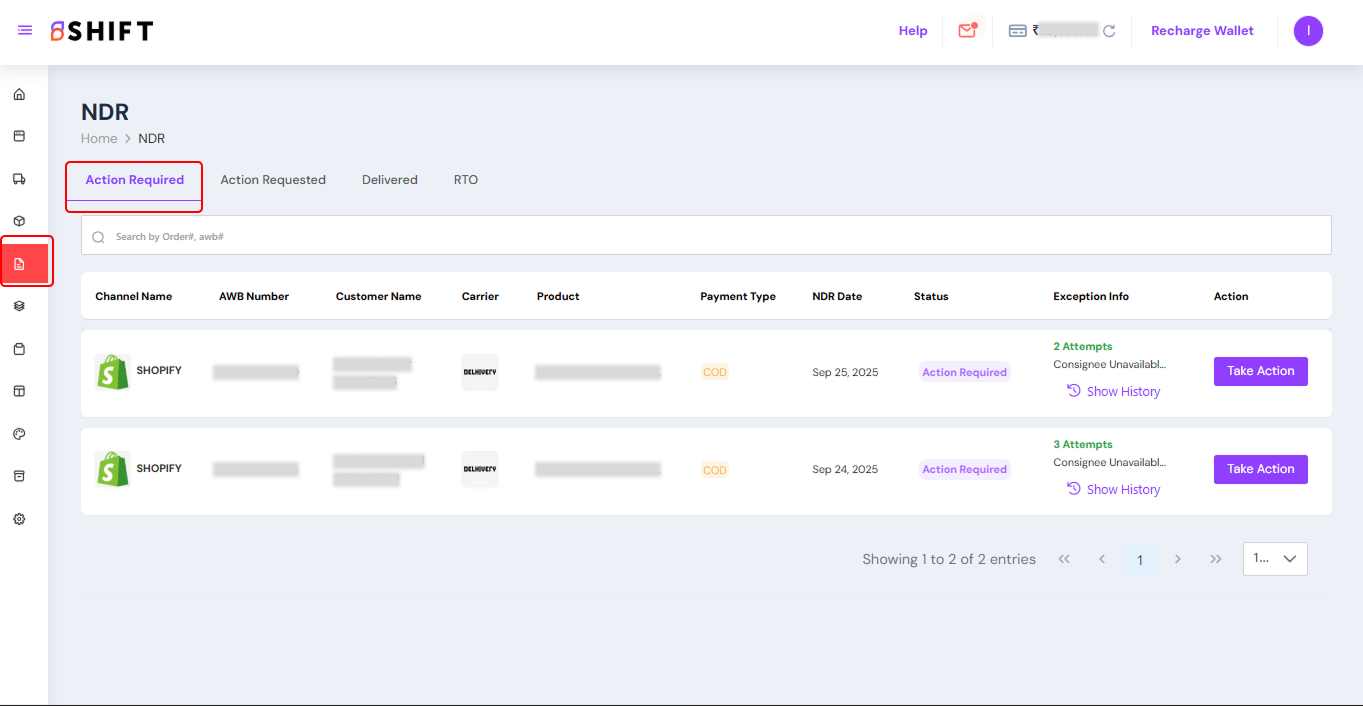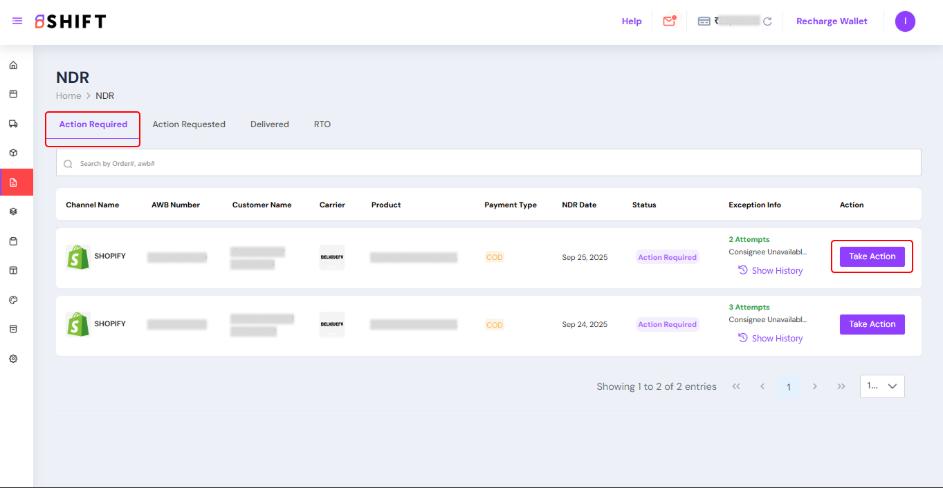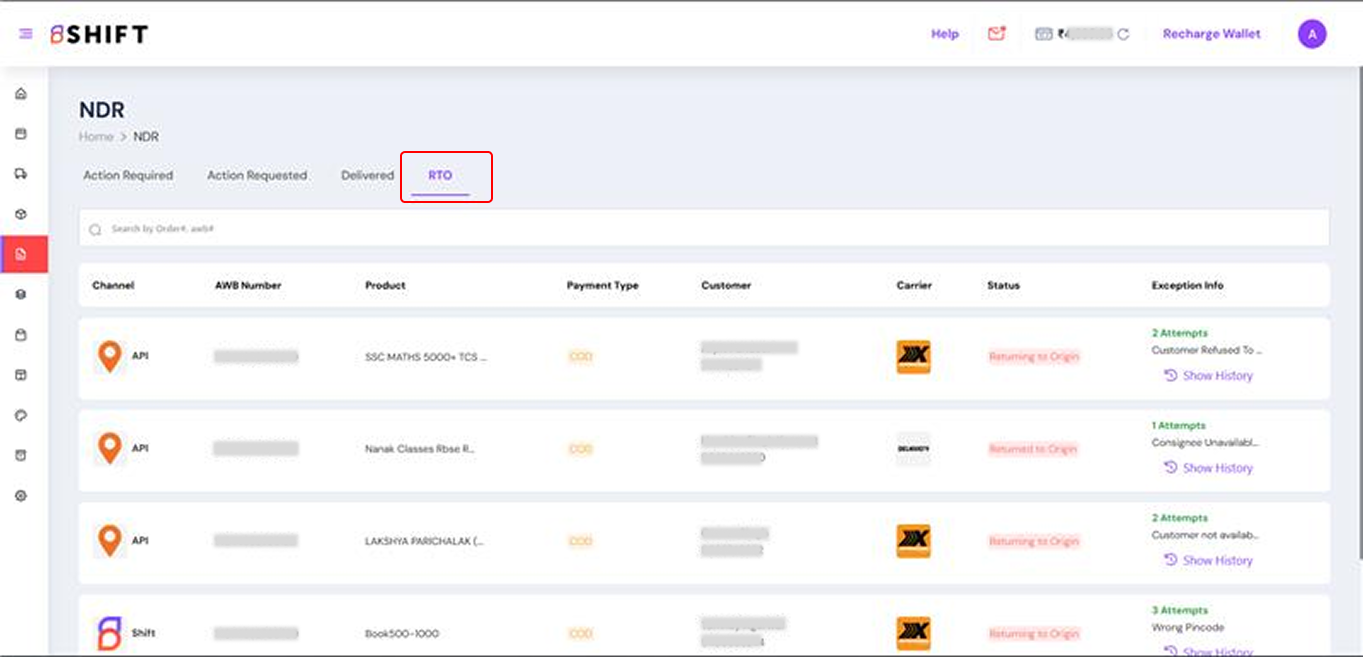 This tab shows shipments that need your immediate attention. For example, reattempting delivery or initiating a Return to Origin (RTO). Taking quick action here helps prevent delays and reduce RTO cases.