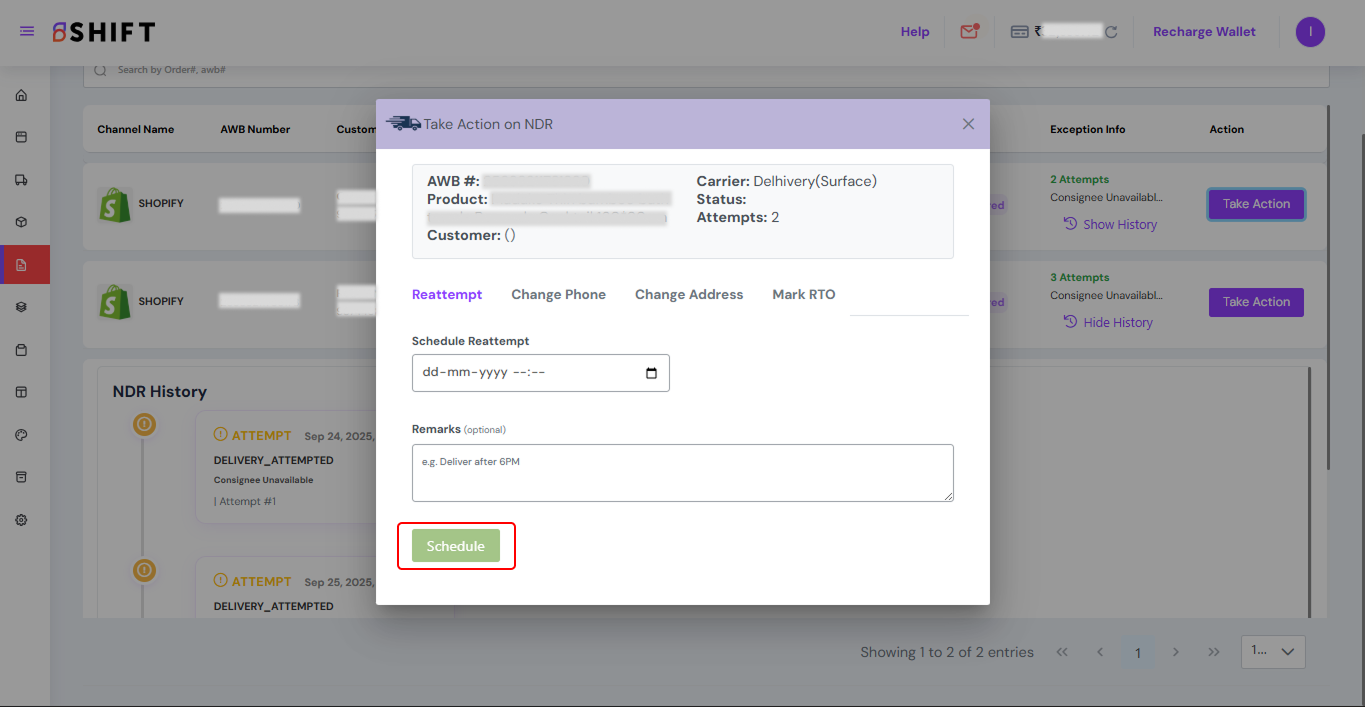 This tab lists shipments where a reattempt or RTO has already been requested. The request may come from Shift or from you. Shipments here are still being processed until they move to another status.